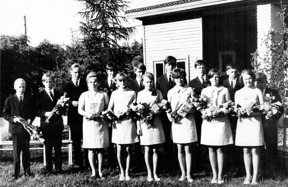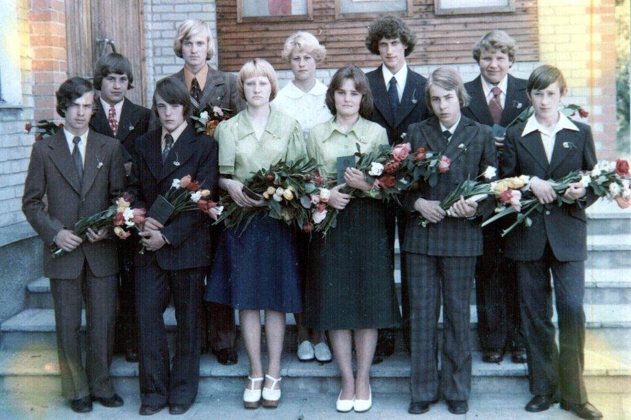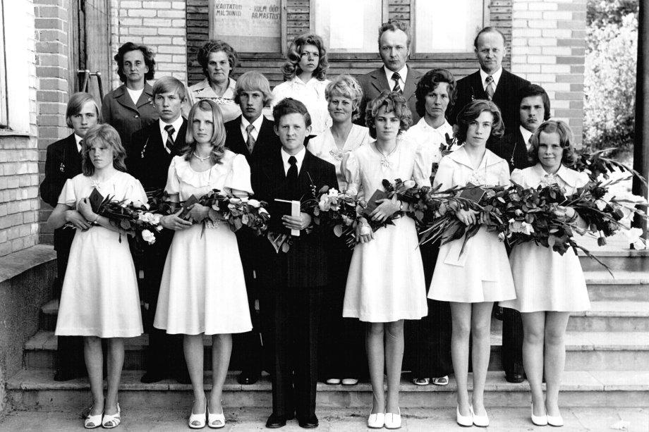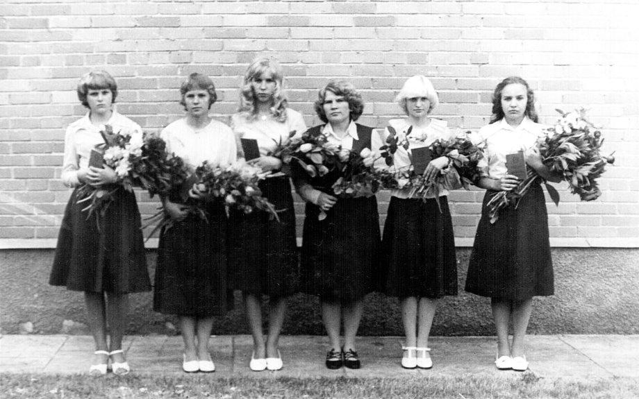 (tagareas vasakult: õp. Rein Tralla; klassijuh. Neida Jalakas; õppealajuh. Vaike Treial; sovh. esindaja Koit Kurvits; õp.-d Maret Tralla ja Aino Kuusemets)