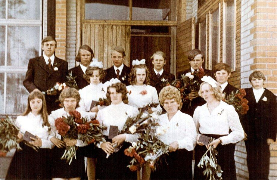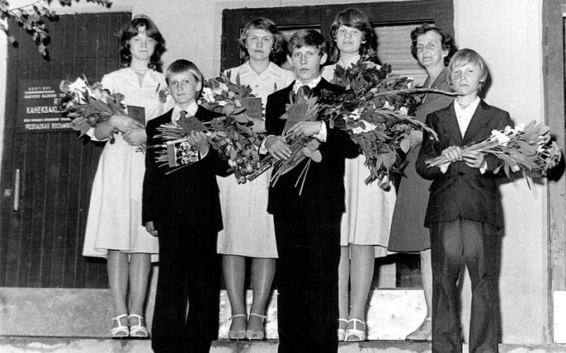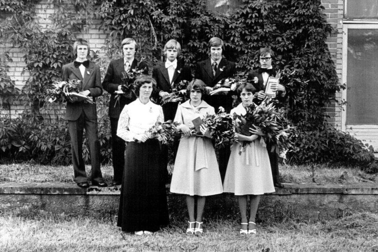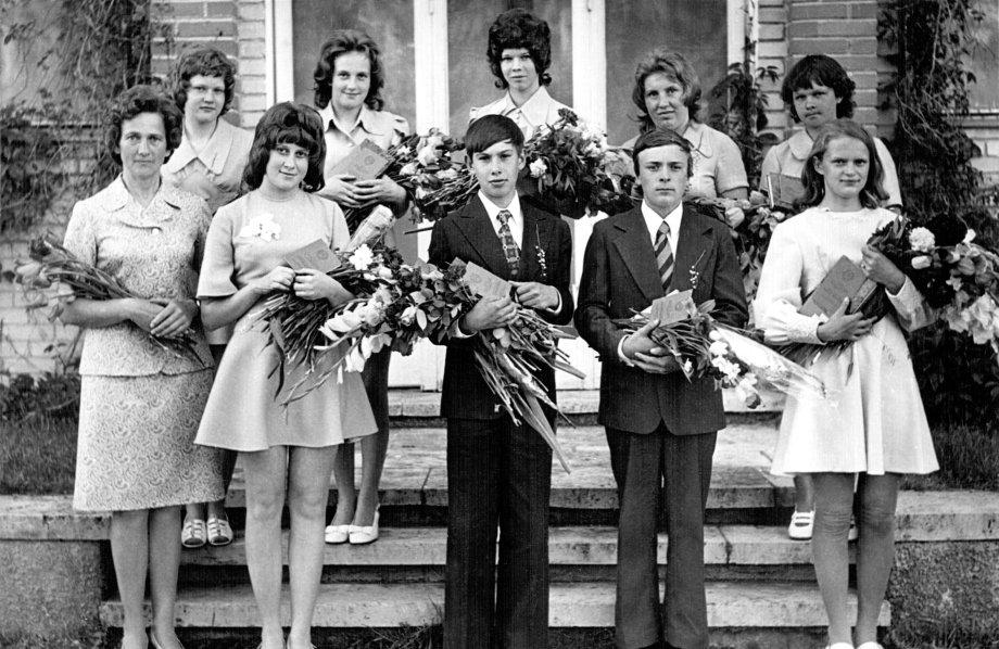 (tagareas vasakult: õp. Rein Tralla; klassijuh. Neida Jalakas; õppealajuh. Vaike Treial; sovh. esindaja Koit Kurvits; õp.-d Maret Tralla ja Aino Kuusemets)